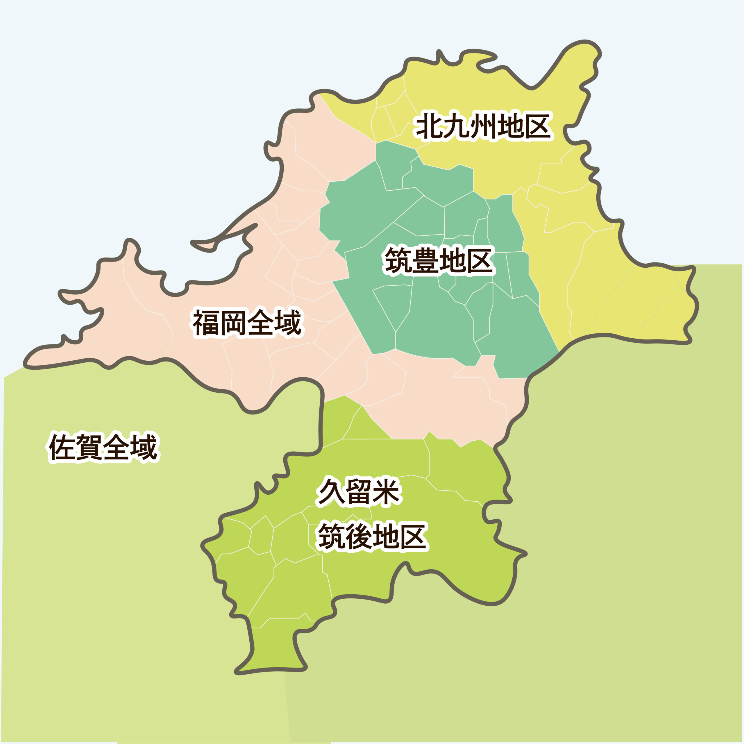 久留米市/福津市/春日市/大野城市/筑紫野市/太宰府市/宗像市/古賀市/朝倉市/糸島市/那珂川市/宇美町/篠栗町/志免町/須恵町/新宮町/久山町/粕屋町/筑前町/北九州市/八女市/筑後市/小郡市/うきは市/みやま市/大刀洗町/大木町/広川町/佐賀全域など